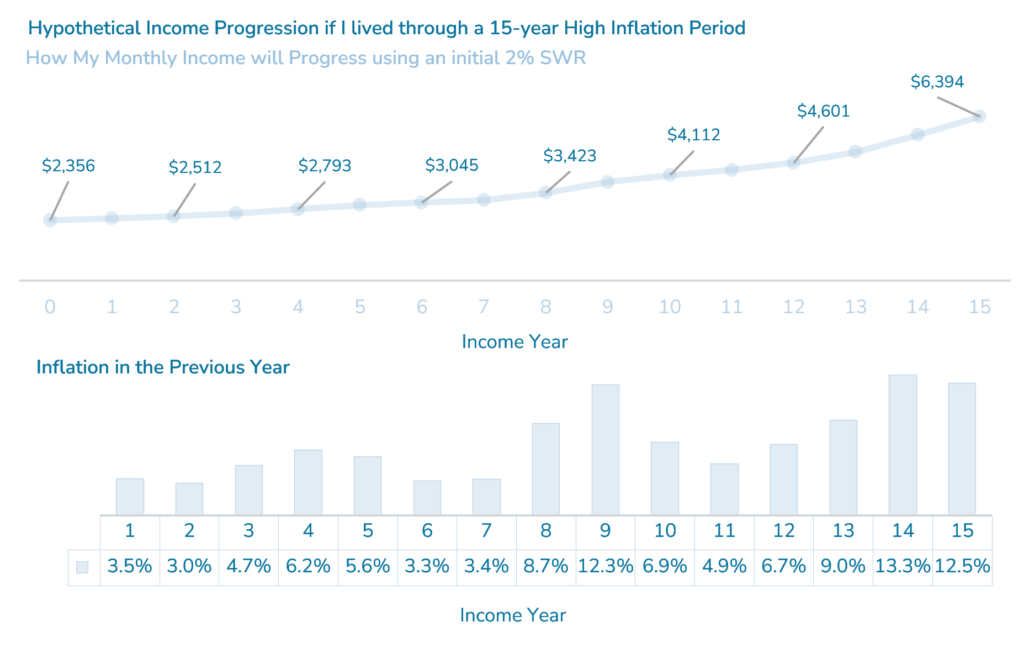 The income for the initial year is based on a 2% Safe Withdrawal Rate. The income for subsequent years is based on the inflation rate in the prior year (refer to the bottom pane of inflation in the previous year). If the inflation is high, the income scales up and if there is deflation, the income is reduced.