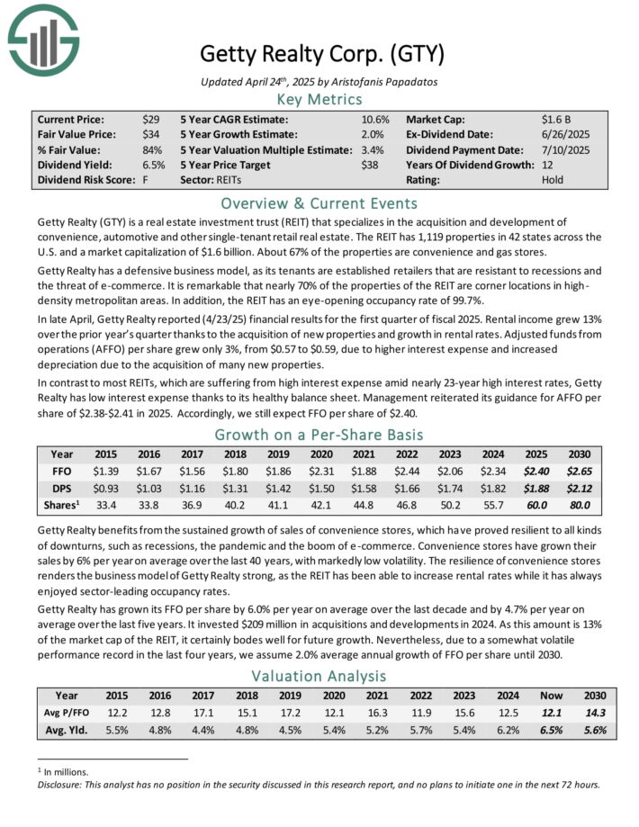 In late April, Getty Realty reported (4/23/25) financial results for the first quarter of fiscal 2025. Rental income grew 13% over the prior year’s quarter thanks to the acquisition of new properties and growth in rental rates.