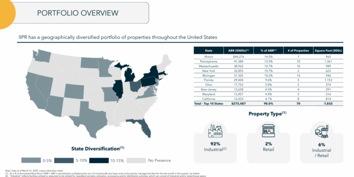 Approximately 92% of IIPR’s properties are industrial, with retail comprising 2% and blended properties the remaining 6%.