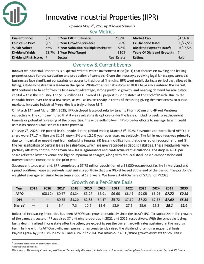 On May 7th, 2025, IIPR posted its Q1 results for the period ending March 31st, 2025. Revenues and normalized AFFO per share were $71.7 million and $1.94, down 5% and 12.2% year-over-year, respectively.