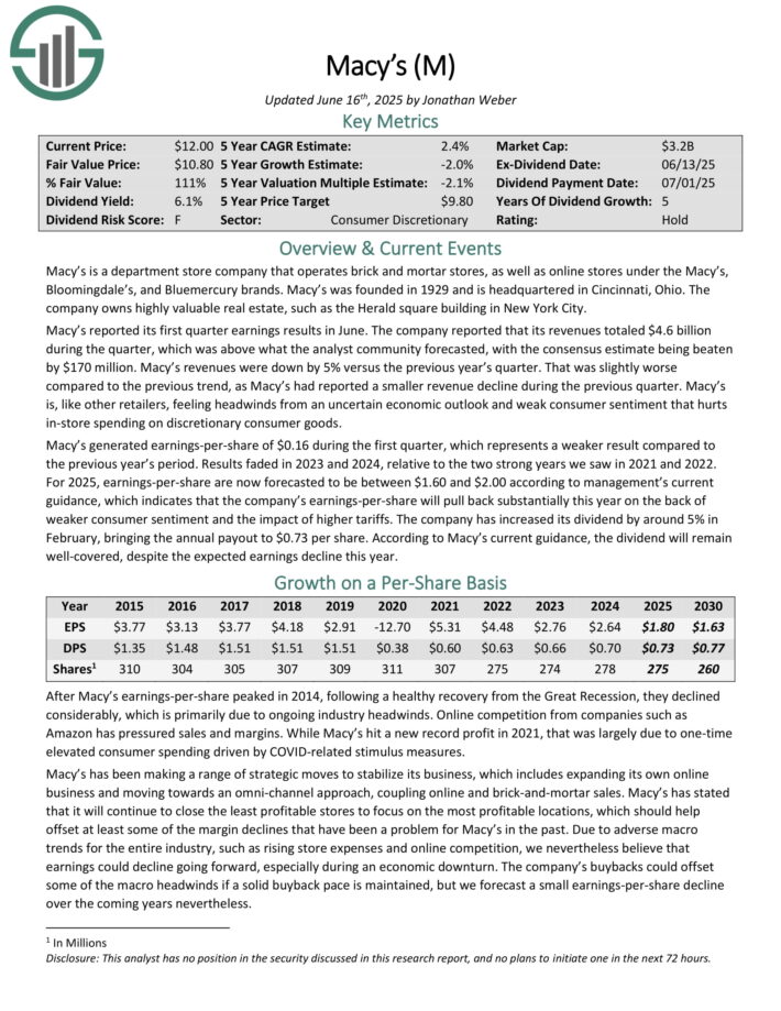 Macy’s generated earnings-per-share of $0.16 during the first quarter, which represents a weaker result compared to the previous year’s period. Results faded in 2023 and 2024, relative to the two strong years we saw in 2021 and 2022. For 2025, earnings-per-share are now forecasted to be between $1.60 and $2.00.
