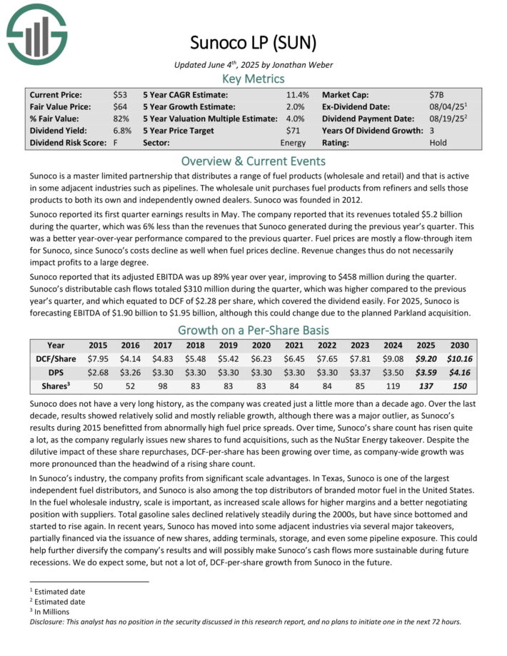 Sunoco reported that its adjusted EBITDA was up 89% year over year, improving to $458 million during the quarter. Distributable cash flows totaled $310 million during the quarter, which equated to DCF of $2.28 per share, and covered the dividend easily. For 2025, Sunoco is forecasting EBITDA of $1.90 billion to $1.95 billion.