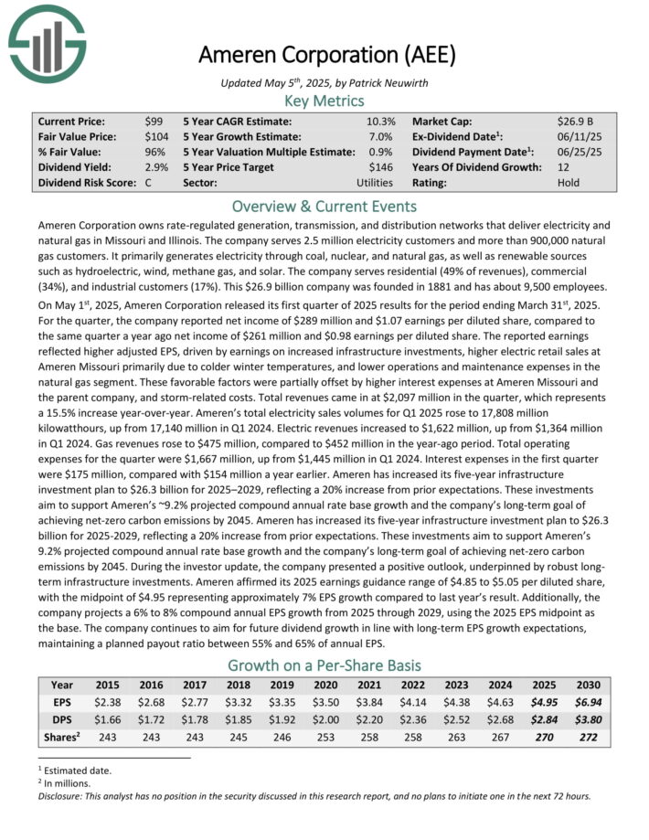 On May 1st, 2025, Ameren Corporation released its first quarter of 2025 results for the period ending March 31st, 2025. For the quarter, the company reported net income of $289 million and $1.07 earnings per diluted share, compared to the same quarter a year ago net income of $261 million and $0.98 earnings per diluted share.