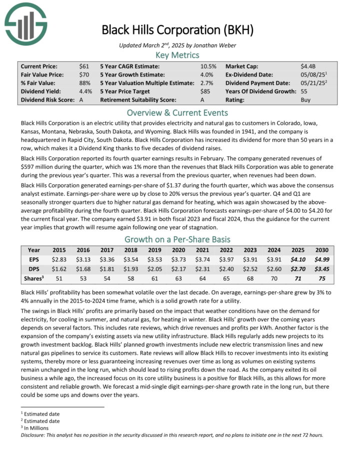 Black Hills Corporation is an electric utility that provides electricity and natural gas to customers in Colorado, Iowa, Kansas, Montana, Nebraska, South Dakota, and Wyoming. Black Hills was founded in 1941, and the company is headquartered in Rapid City, South Dakota.