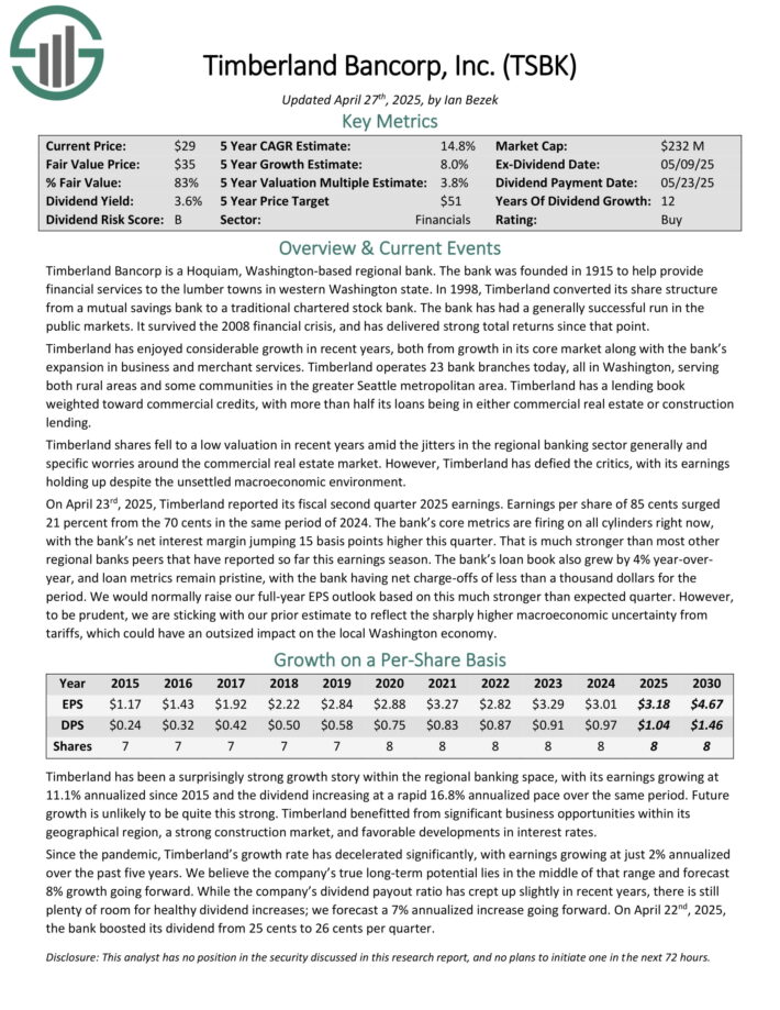 On April 23rd, 2025, Timberland reported its fiscal second quarter 2025 earnings. Earnings per share of 85 cents surged 21 percent from the 70 cents in the same period of 2024. The bank’s core metrics are firing on all cylinders right now, with the bank’s net interest margin jumping 15 basis points higher this quarter.