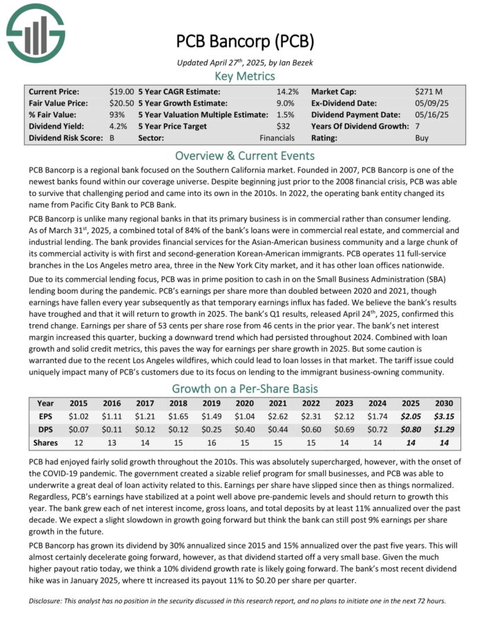 PCB Bancorp is a regional bank focused on the Southern California market. Founded in 2007, PCB Bancorp is one of the newest banks found within our coverage universe.