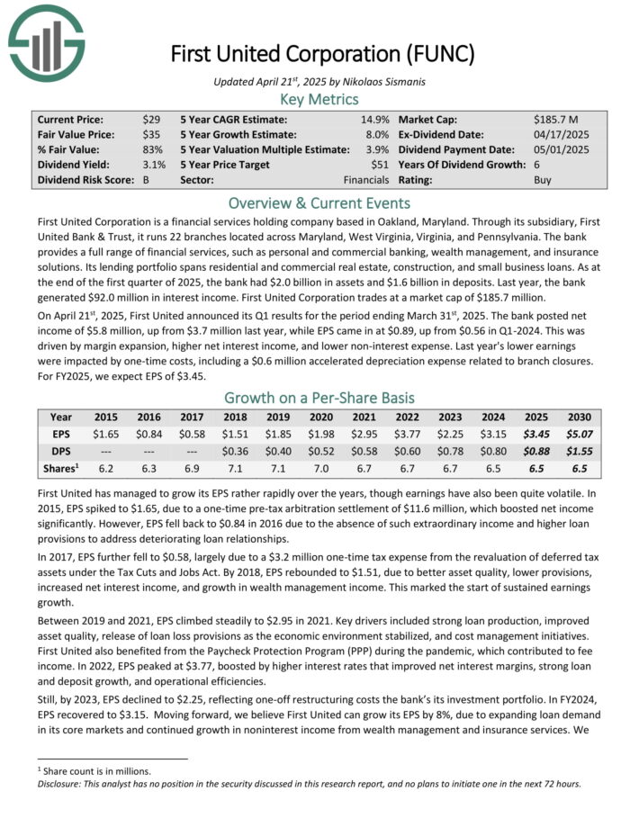 On April 21st, 2025, First United announced its Q1 results for the period ending March 31st, 2025. The bank posted net income of $5.8 million, up from $3.7 million last year, while EPS came in at $0.89, up from $0.56 in Q1-2024. This was driven by margin expansion, higher net interest income, and lower non-interest expense.