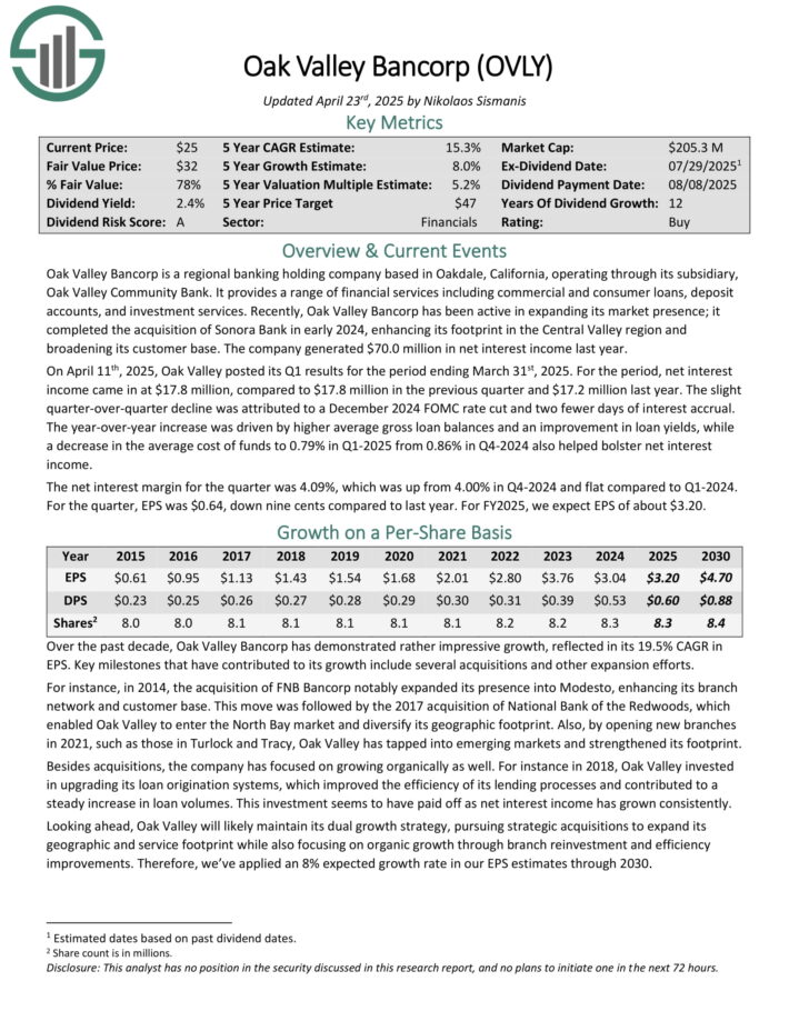 Oak Valley Bancorp is a regional banking holding company based in Oakdale, California, operating through its subsidiary, Oak Valley Community Bank. It provides a range of financial services including commercial and consumer loans, deposit accounts, and investment services.