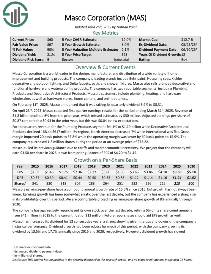 On April 23rd, 2025, Masco reported first quarter earnings results. Revenue of $1.8 billion declined 6% from the prior year, which missed estimates by $30 million. Adjusted earnings-per-share of $0.87 compared to $0.93 in the prior year, but this was $0.04 below expectations.