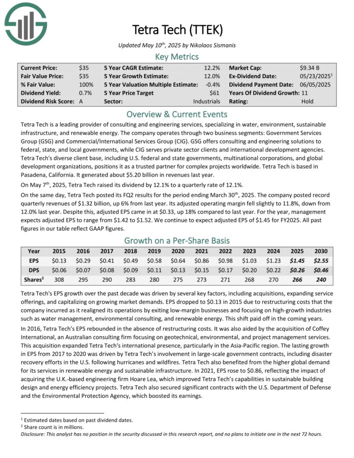 On May 7th, 2025, Tetra Tech raised its dividend by 12.1% to a quarterly rate of 12.1%. On the same day, Tetra Tech posted its FQ2 results for the period ending March 30th, 2025.