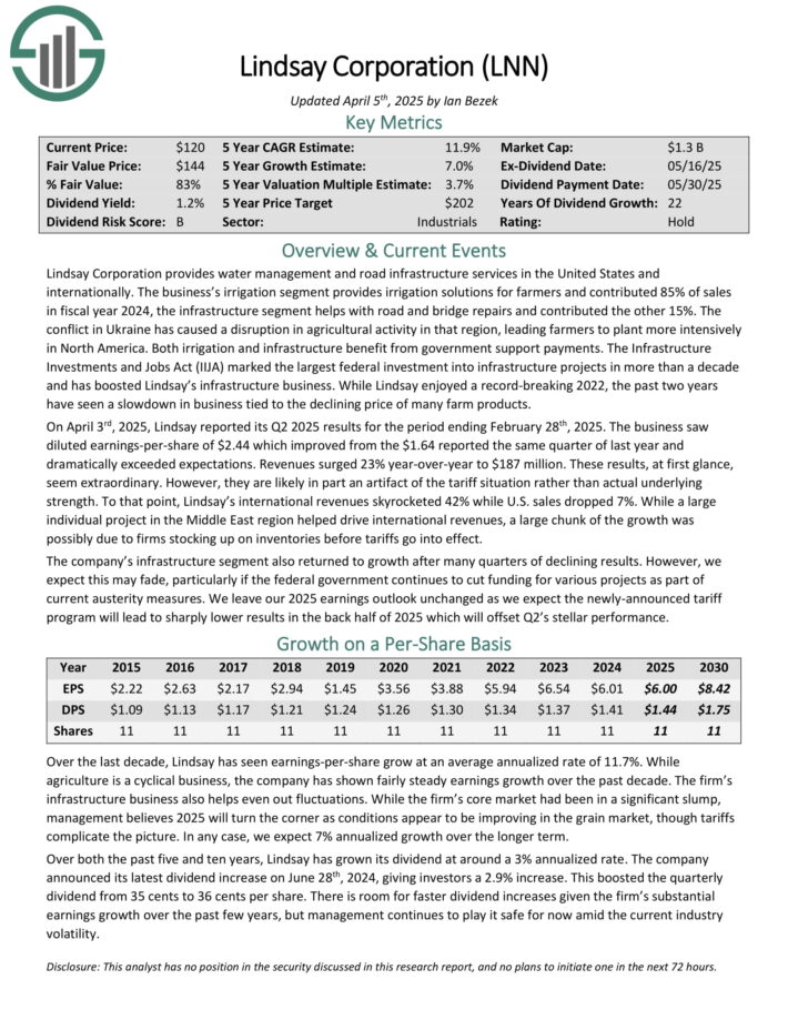 On April 3rd, 2025, Lindsay reported its Q2 2025 results for the period ending February 28th, 2025. The business saw diluted earnings-per-share of $2.44 which improved from the $1.64 reported the same quarter of last year and dramatically exceeded expectations. Revenues surged 23% year-over-year to $187 million.