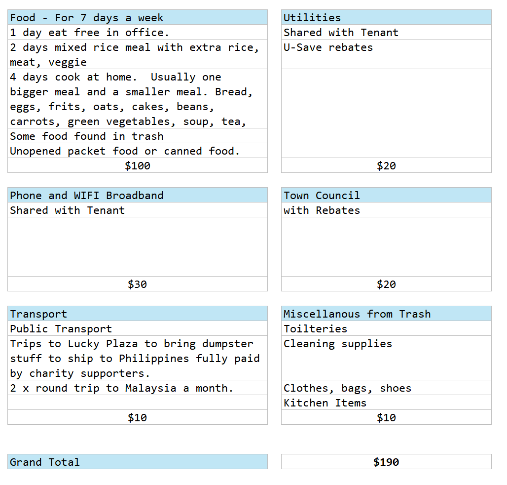 The large part of his expense comes from food and his food makes up of free office food, Cai png and home prep food. Colin says his Cai png is $3 and often consist of one meat and one vegetables. I can see the price of where he lives to be like that.