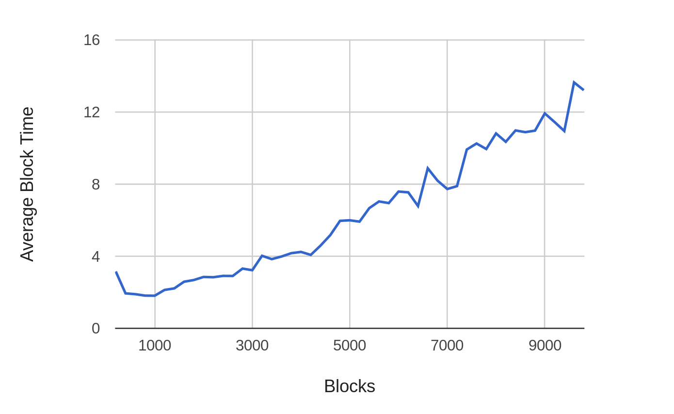 After a few thousand blocks, we see the difficulty going up enough for block times to get into the 4-5 second range. After 9k blocks, we're starting to approach the target time of 15 seconds.