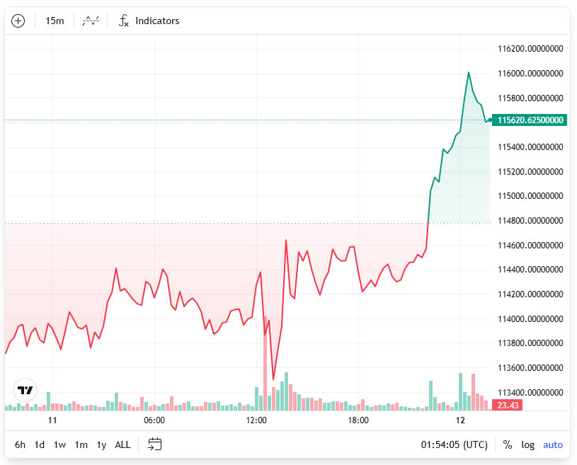 Bitcoin has made a move during early trading on Friday, topping $116,000 for the first time in three weeks following a 1.5% daily gain.