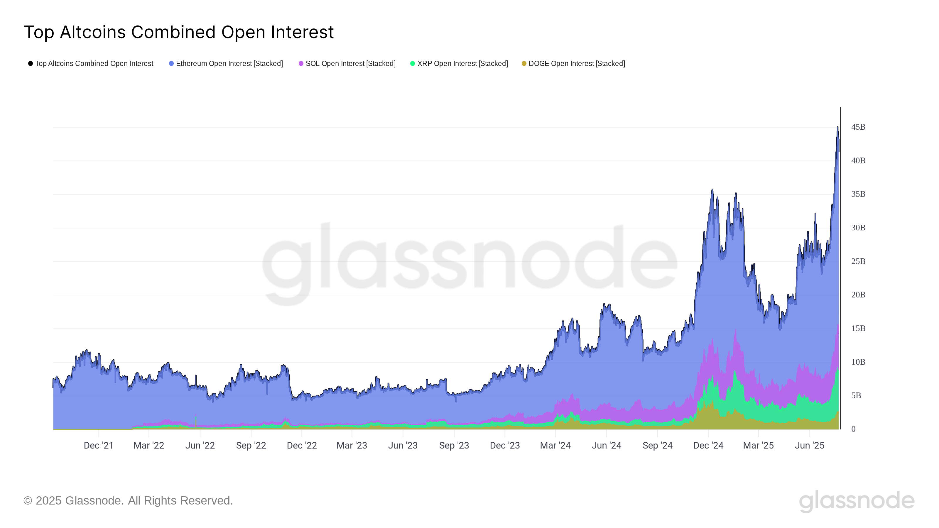 OI for four of the top altcoins by market cap passed $40 billion on Monday, Glassnode data confirms, marking a new all-time high.