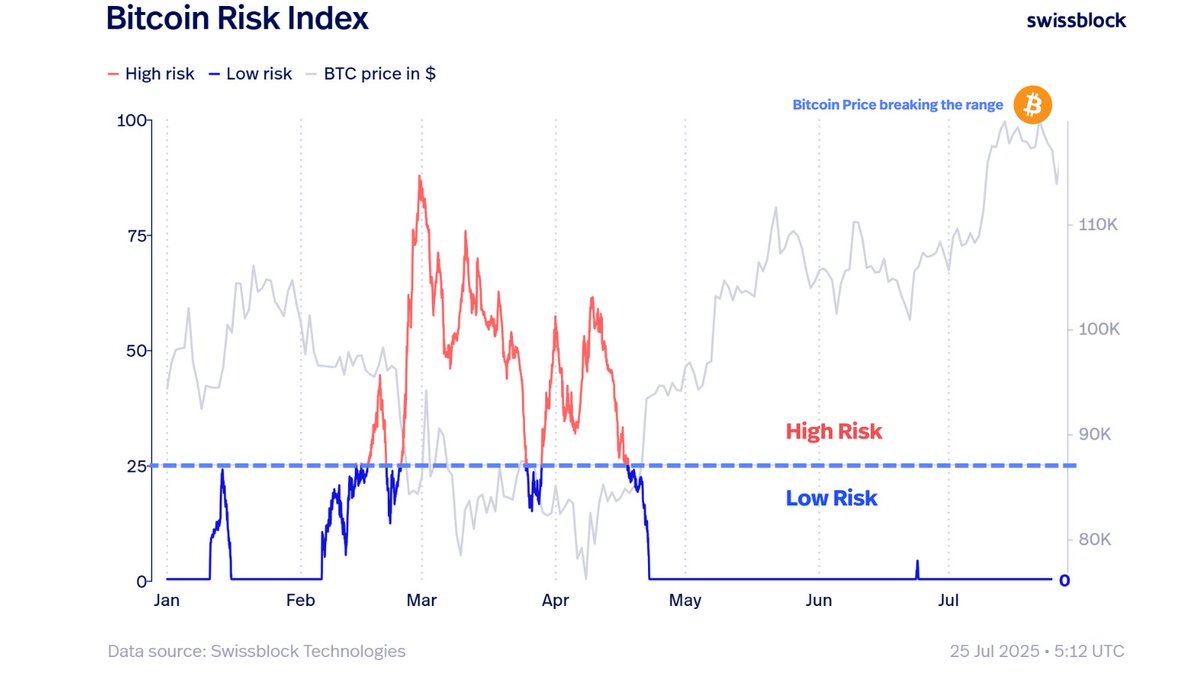 The Bitcoin risk index, a metric that gauges the likelihood of significant BTC price drawdowns, is currently at zero. This indicates that there is “no overheating” and the bullish structure remains intact, Swissblock said, adding: