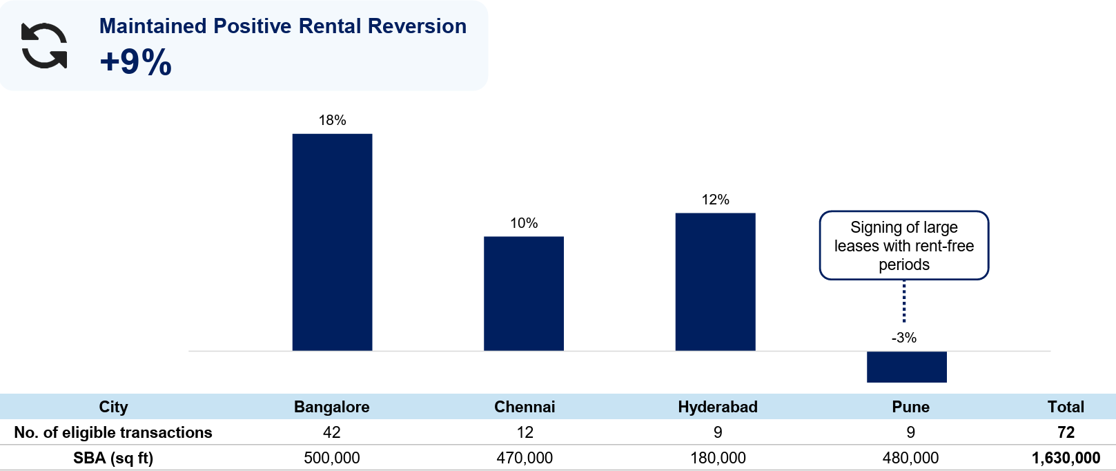 CLINT achieved a healthy +9% portfolio rental reversion in 1H FY25, with positive reversions across Bangalore, Chennai and Hyderabad.