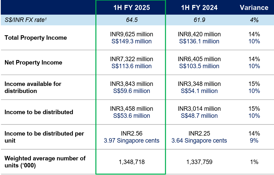 Despite a weaker INR against SGD, total property income, NPI, income available for distribution, and DPU all improved YoY. This was mainly driven by: