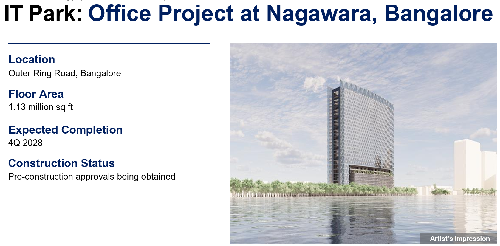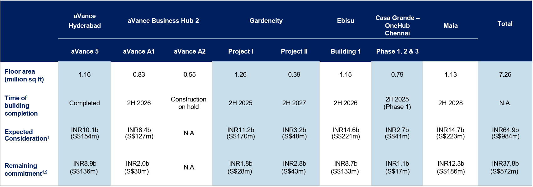 Expected 2H 2025 completions:Gardencity Project ICasa Grande – OpenHub Chennai Phase 1Expected 2H 2026 completions:aVance A1Ebisu Building 1Expected 2H 2027 completions:Gardencity Project IIExpected 2028 completions :MaiaNagawara IT Park