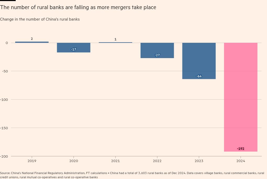 Nearly one in 20 of the country’s rural banks have shut their doors over the past year, according to data from China’s National Financial Regulatory Administration, in a sweeping revamp of the banking sector in the aftermath of a years-long property crisis.