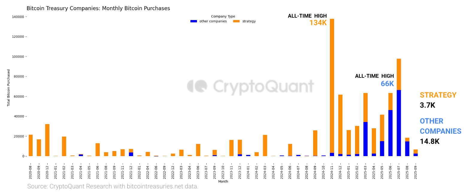 For example, Strategy’s average purchase size fell to 1,200 BTC in August compared to its 2025 peak of 14,000 BTC, while other companies purchased 86% less Bitcoin compared to their 2025 high of 2,400 BTC in March.