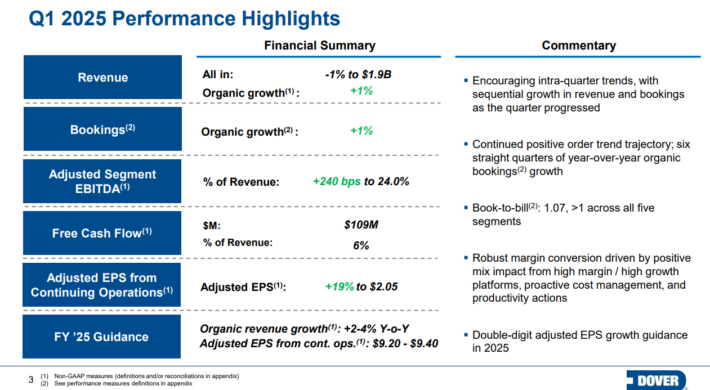 Dover Corporation reported its financial results for Q1 2025 on April 24th, 2025. Revenue declined by 10.8% to $1.87 billion compared to the same period in 2024, though this was partially due to business divestments. On a comparable basis, revenue was down 1%. Adjusted earnings-per-share of $2.05 were up from $1.95 in the prior year.