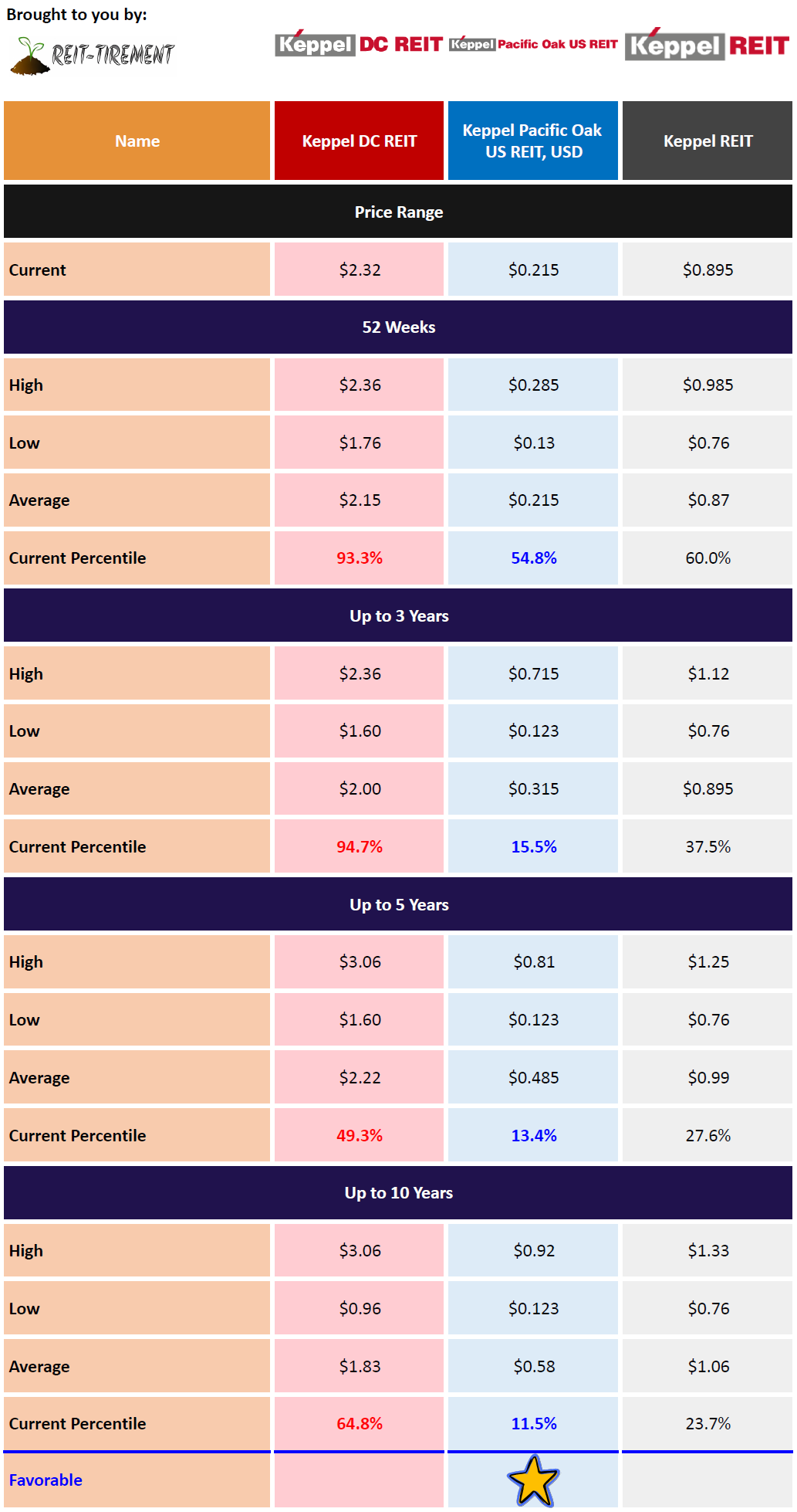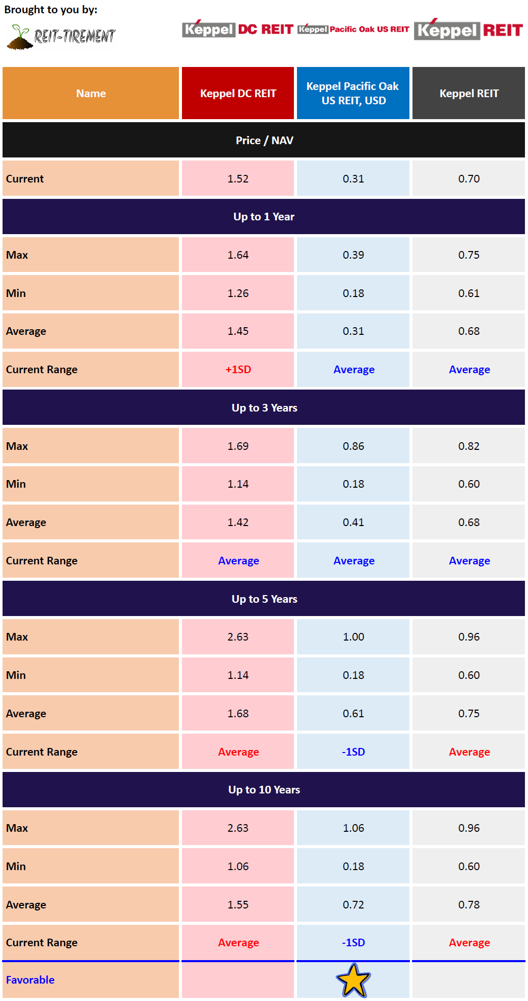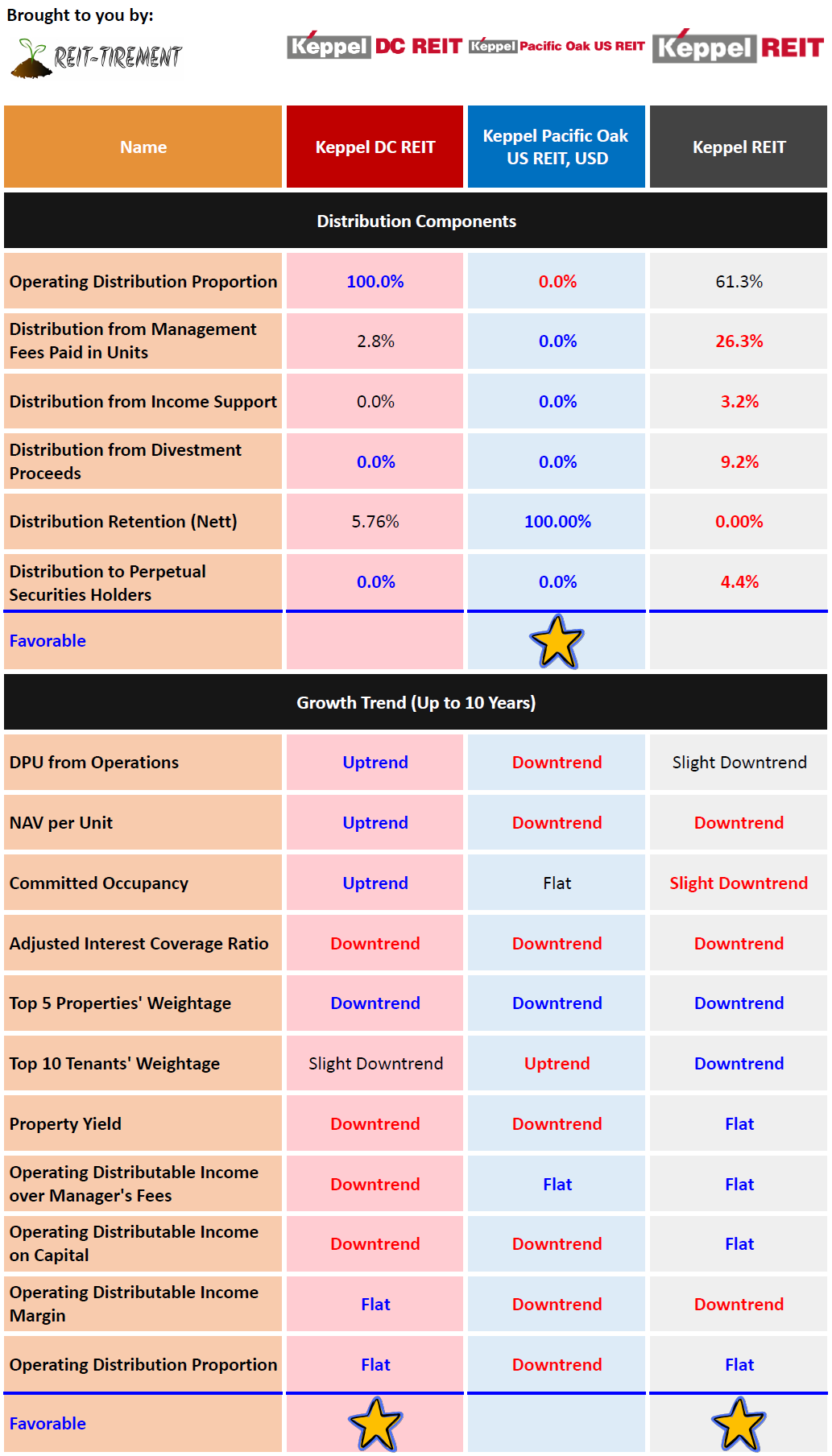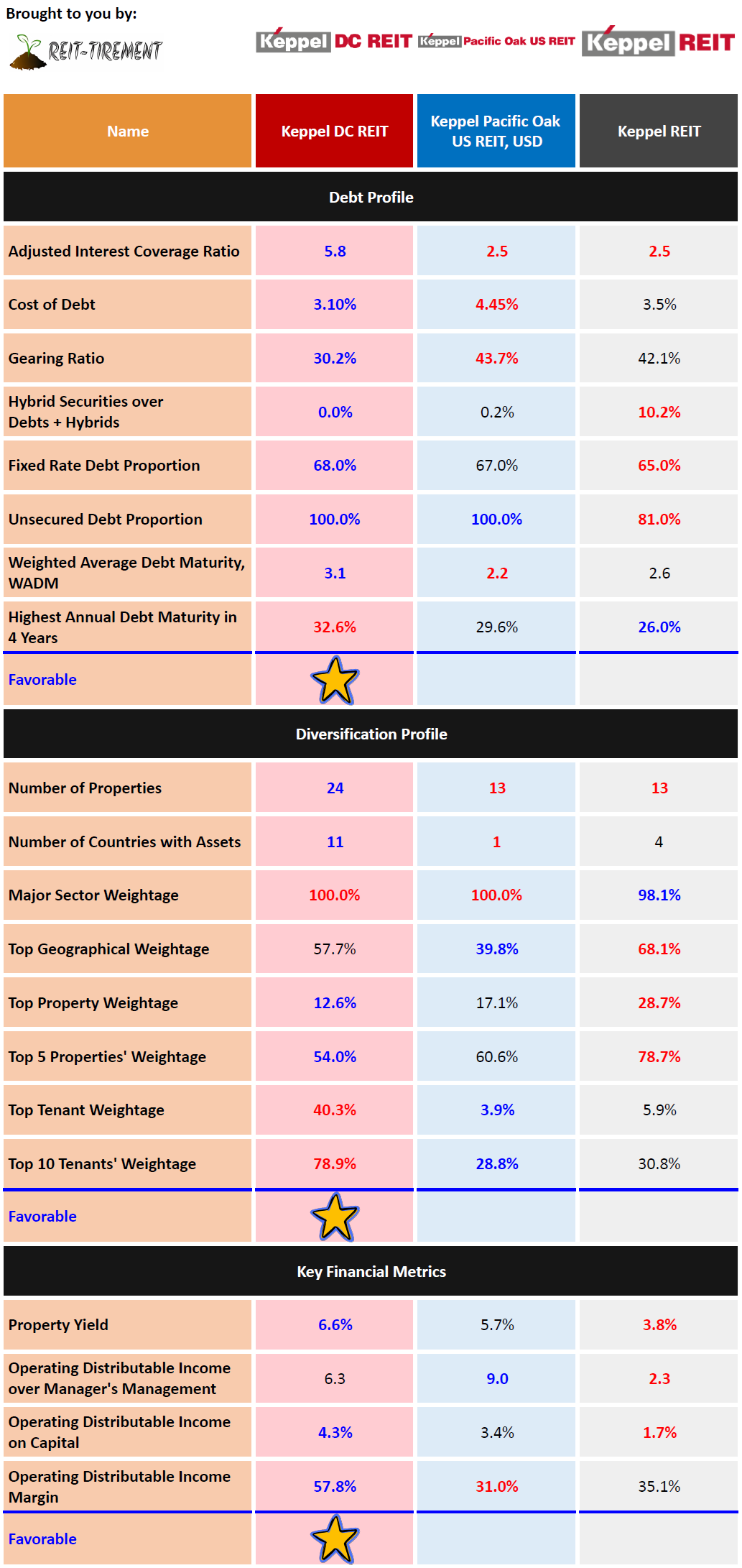 Below is a comparison using the latest data from comparison tables on S-REITs Comparison page. The most favorable figures are marked in blue and given a +1 score, while the least favorable are in red with a -1 score. The highest score in each category determines the winner. Note that this is a simple comparison without weightage assigned to each figure and this may not be an apple-to-apple comparison as each focuses on a different sector or a different geographical location.