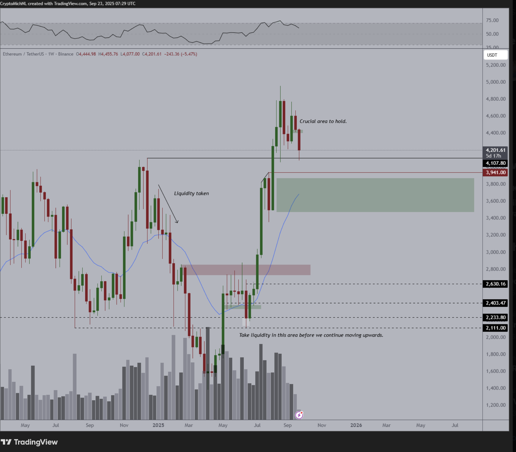 The measured move from this triangle setup points toward $3,560, suggesting ETH could fall another 15% from current levels before October if selling pressure persists.