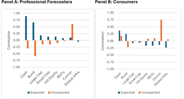 When thinking about the potential benefits of investments in a portfolio, though, it’s important to view the impact of an allocation holistically, not in isolation. Not only do real assets have lower correlations with more traditional asset classes, but they also serve as important diversifiers when inflation varies from expectations (i.e. periods of higher unexpected inflation). This effect is documented in Exhibit 3, which includes asset class return correlations with both expected and unexpected inflation levels, based on professional forecasters’ expectations (Panel A) and consumer expectations (Panel B).