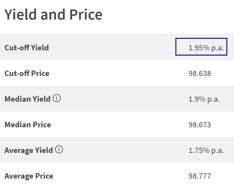The cut-off yield for the latest MAS bill auctioned on 10th May (5 days ago) is 1.95%. The MAS bill is 9 basis points lower than the last issue two weeks ago.