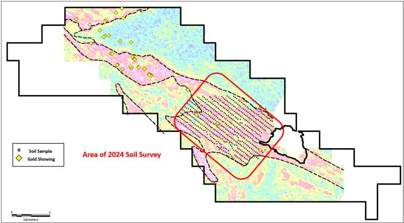 The soil sampling program was carried out by IOS Services Geoscientifiques in October and November 2024 and included the collection of 605 soil samples covering favourable geology and a distinctive magnetic domain in the central part of the property (Figures 2 and 3).