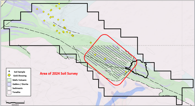 The soil sampling program, in conjunction with the recently released results of the prospecting and geological mapping was carried in the central part of the Mosseau property The soil sampling program has confirmed existing drill targets along the Kiask River Mineralized Corridor, as well as identified new targets in the central part of the Mosseau property. Previously recognized mineralization in the central part of the property along the Kiask River Mineralization Corridor, identified by Vior in 2017, included 2.93 g/t Au over 5.0 m from drilling and grab samples up to 12.9 g/t Au. The mineralization was confirmed and extended along strike from results of the 2024 prospecting and mapping program (Press release May 15, 2025)