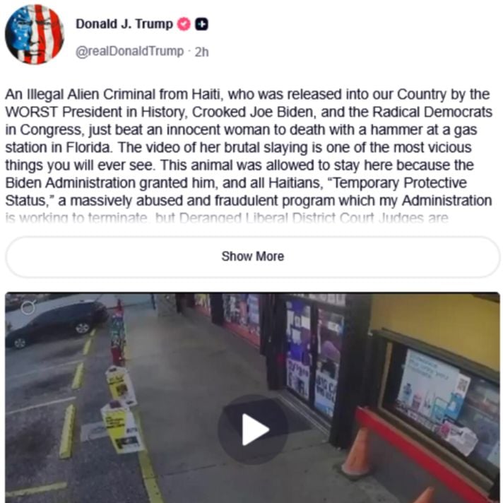 Thursday evening, Trump shared the surveillance footage on Truth Social. Not a description. Not a still frame. The actual video of a woman being bludgeoned to death, posted by the sitting president to score an immigration point.