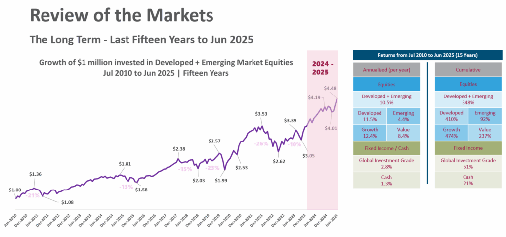It shows the same MSCI ACWI IMI over the past 15 years. Since ACWI IMI is Developed markets plus emerging markets large cap, mid cap and small caps, the annualized return is 10.5% and the cumulative return is 348%.