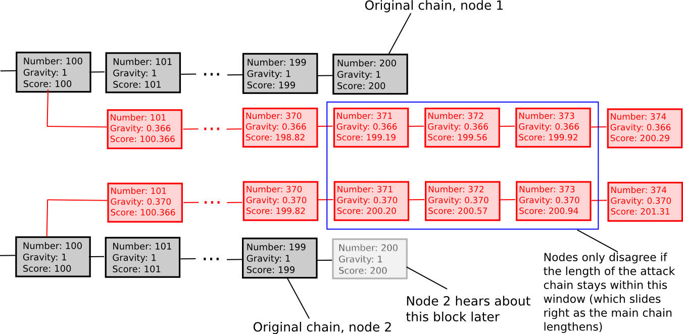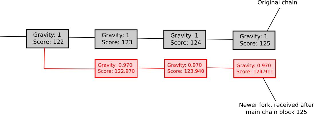 - If a node sees a new block B' with B as parent, then if n is the length of the longest chain of descendants from B at that time, gravity(B') = gravity(B) * 0.99 ^ n (note that values other than 0.99 can also be used).