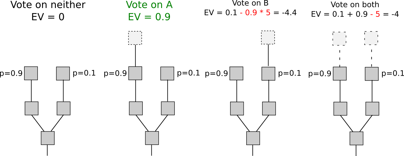 Another set of strategies, called “Slasher 2.0” (in contrast to Slasher 1.0, the original security deposit-based proof of stake algorithm), involves simply penalizing voters that vote on the wrong fork, not voters that double-vote. This makes analysis substantially simpler, as it removes the need to pre-select voters many blocks in advance to prevent probabilistic double-voting strategies, although it does have the cost that users may be unwilling to sign anything if there are two alternatives of a block at a given height. If we want to give users the option to sign in such circumstances, a variant of logarithmic scoring rules can be used (see here for more detailed investigation). For the purposes of this discussion, Slasher 1.0 and Slasher 2.0 have identical properties.