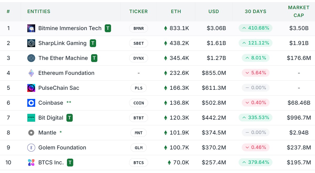 As ETH hovered around $3,700, BitMine became the fourth-largest crypto treasury firm, trailing behind Strategy, MARA Holdings and Twenty One Capital.