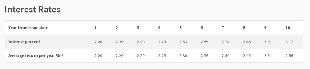 However, if you only hold the SSB bonds for one year, with two semi-annual payments, your interest rate is 2.2%/yr.