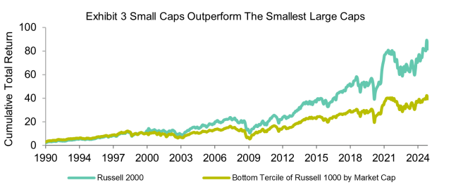 My analysis further disputes this view if we compare performance between small caps and the bottom tercile of large caps, as seen in Exhibit 3. Small caps consistently outperformed the smallest large-cap stocks since 1990.