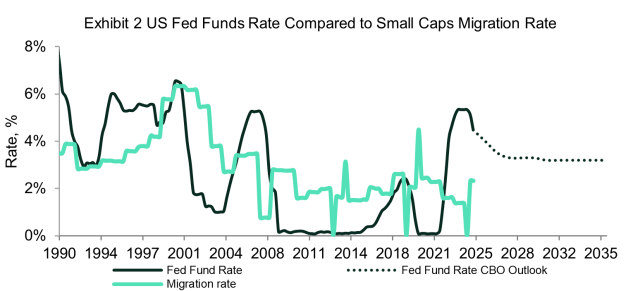 - Higher interest rates are reigniting migration. With rates expected to stay elevated, small-cap stocks are more likely to graduate to large caps — boosting overall performance potential.