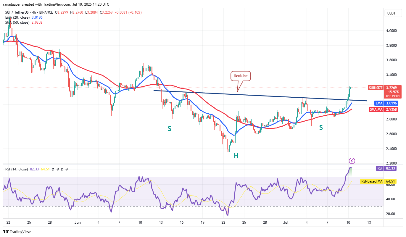 The 20-day EMA is trying to turn up, and the relative strength index (RSI) has jumped into positive territory, indicating that the bulls are back in the game. If buyers maintain the price above the 50-day SMA, the SUI/USDT pair could climb to $3.55.