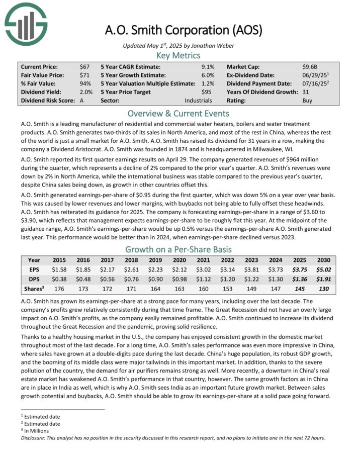 A.O. Smith generated earnings-per-share of $0.95 during the first quarter, which was down 5% on a year over year basis. This was caused by lower revenues and lower margins, with buybacks not being able to fully offset these headwinds.