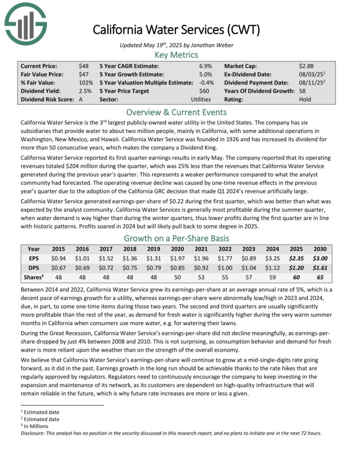 California Water Service was founded in 1926 and has increased its dividend for more than 50 consecutive years, which makes the company a Dividend King.
