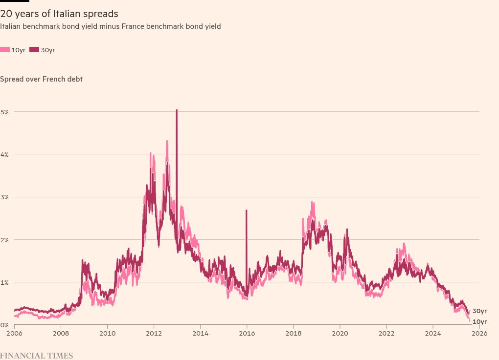 Looking out to 10 and 30 years, Italian bonds still offer higher yields than their French bond counterparts. But they are increasingly seen as much of a muchness:
