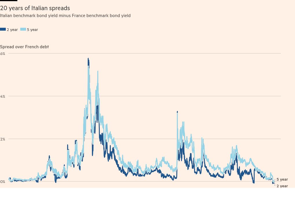 But this week the spread of five-year BTPS over five-year OATS has flipped from positive to negative: