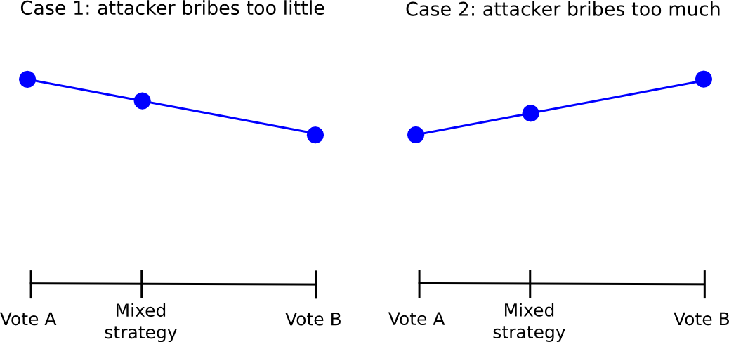 However, this approach itself suffers from the flaw that, if the attacker's bribe is high enough, even from there one can defect. The fundamental problem is that given a probabilistic mixed strategy between A and B, for each the return always changes (almost) linearly with the probability parameter. Hence, if, for the individual, it makes more sense to vote for B than for A, it will also make more sense to vote with probability 0.51 for B than with probability 0.49 for B, and voting with probability 1 for B will work even better.