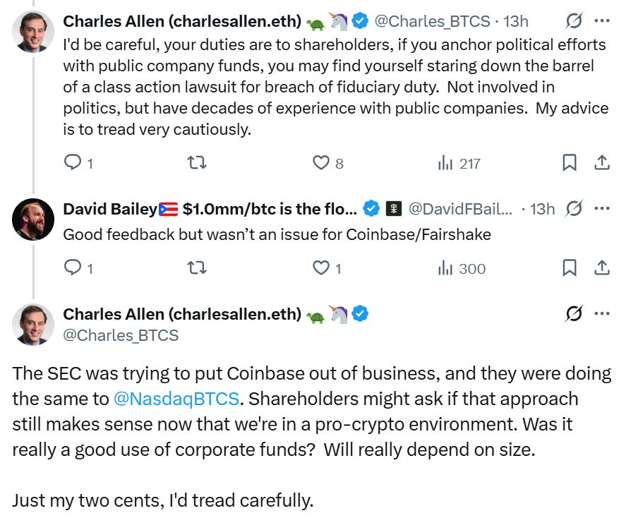 “Shareholders might ask if that approach still makes sense now that we’re in a pro-crypto environment. Was it really a good use of corporate funds? Will really depend on size. Just my two cents, I’d tread carefully,” Allen added.