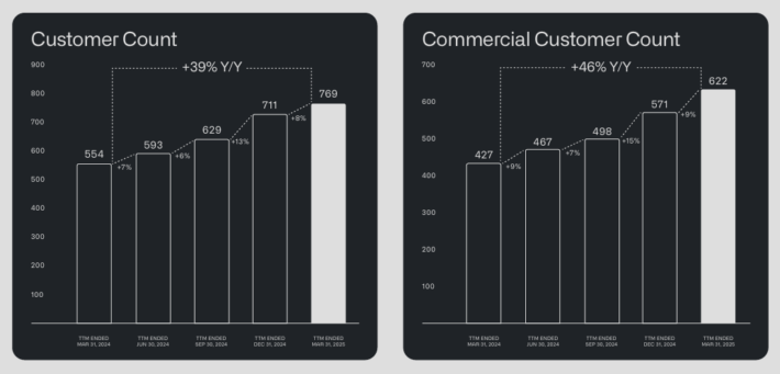 Palantir also has the benefit of growing customers while also reducing in reliance on just a few customers.